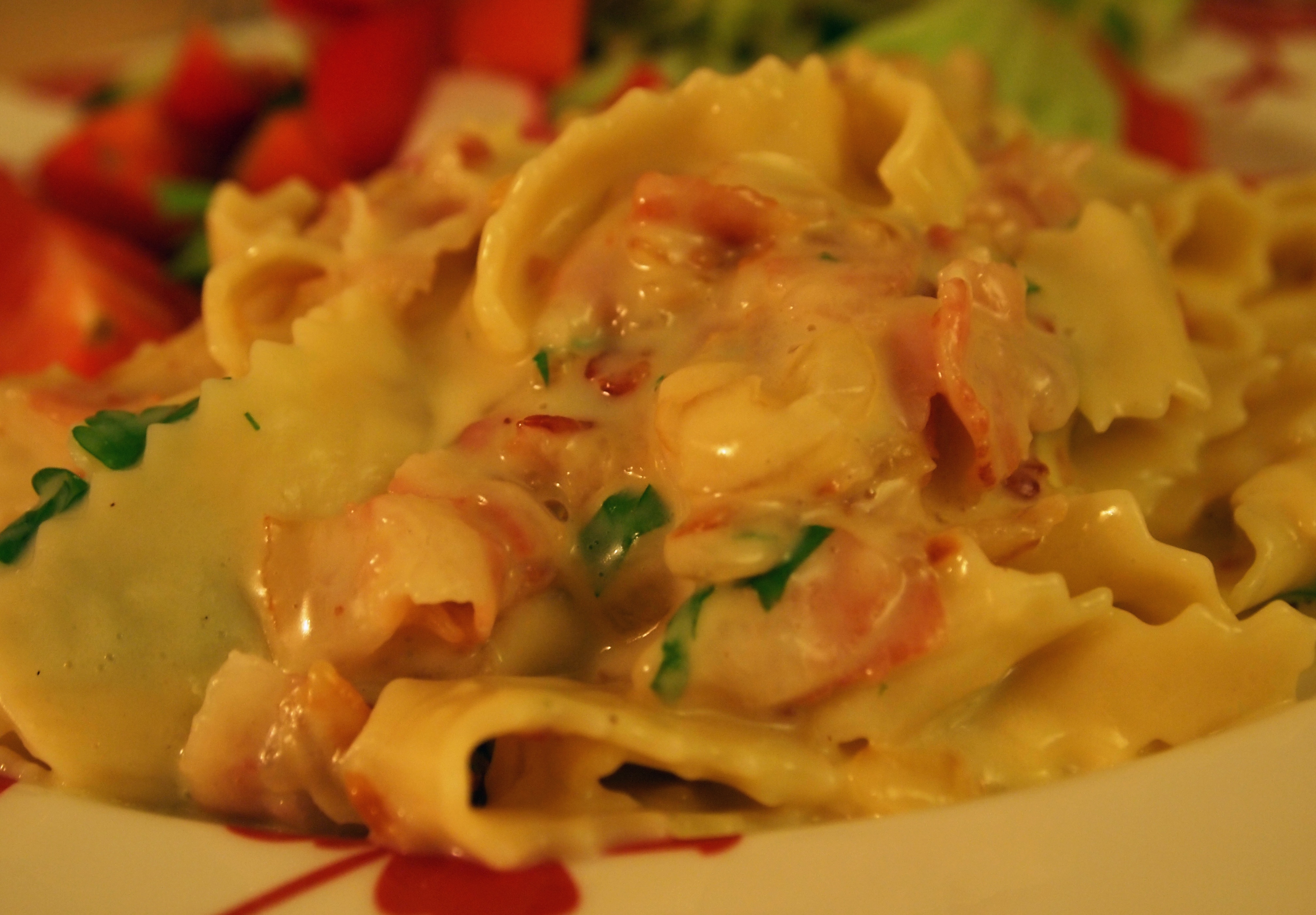 Put a pan of pasta on to cook. Fry half a diced onion and a clove of garlic in some olive oil. Add diced pancetta or a few rashers of streaky bacon once the onion’s cooked and fry until crispy. In a bowl, mix two egg yolks with two heaped tablespoons of creme fraiche and some grated Parmesan. Add black pepper but not salt as the bacon will have supplied this.