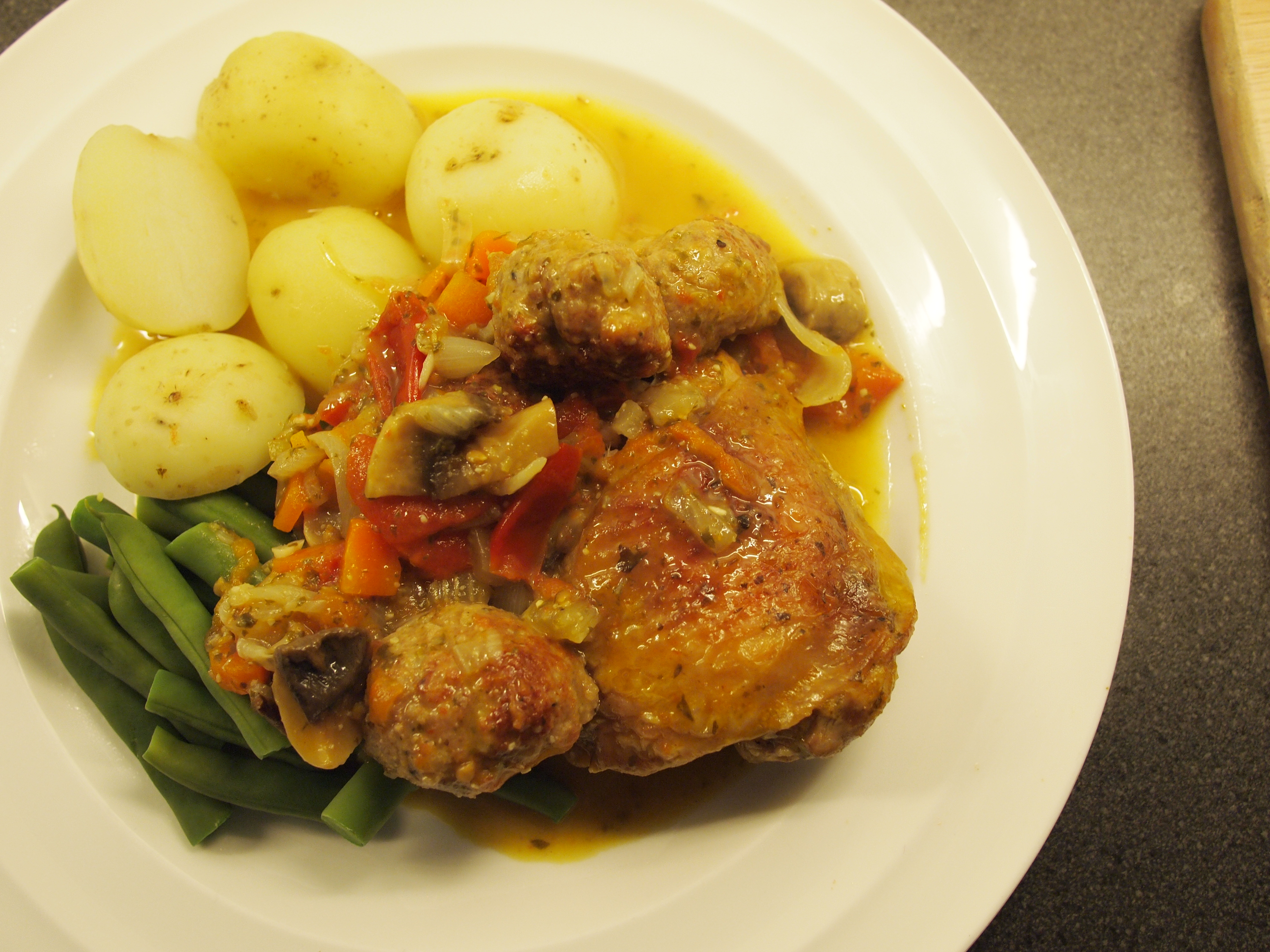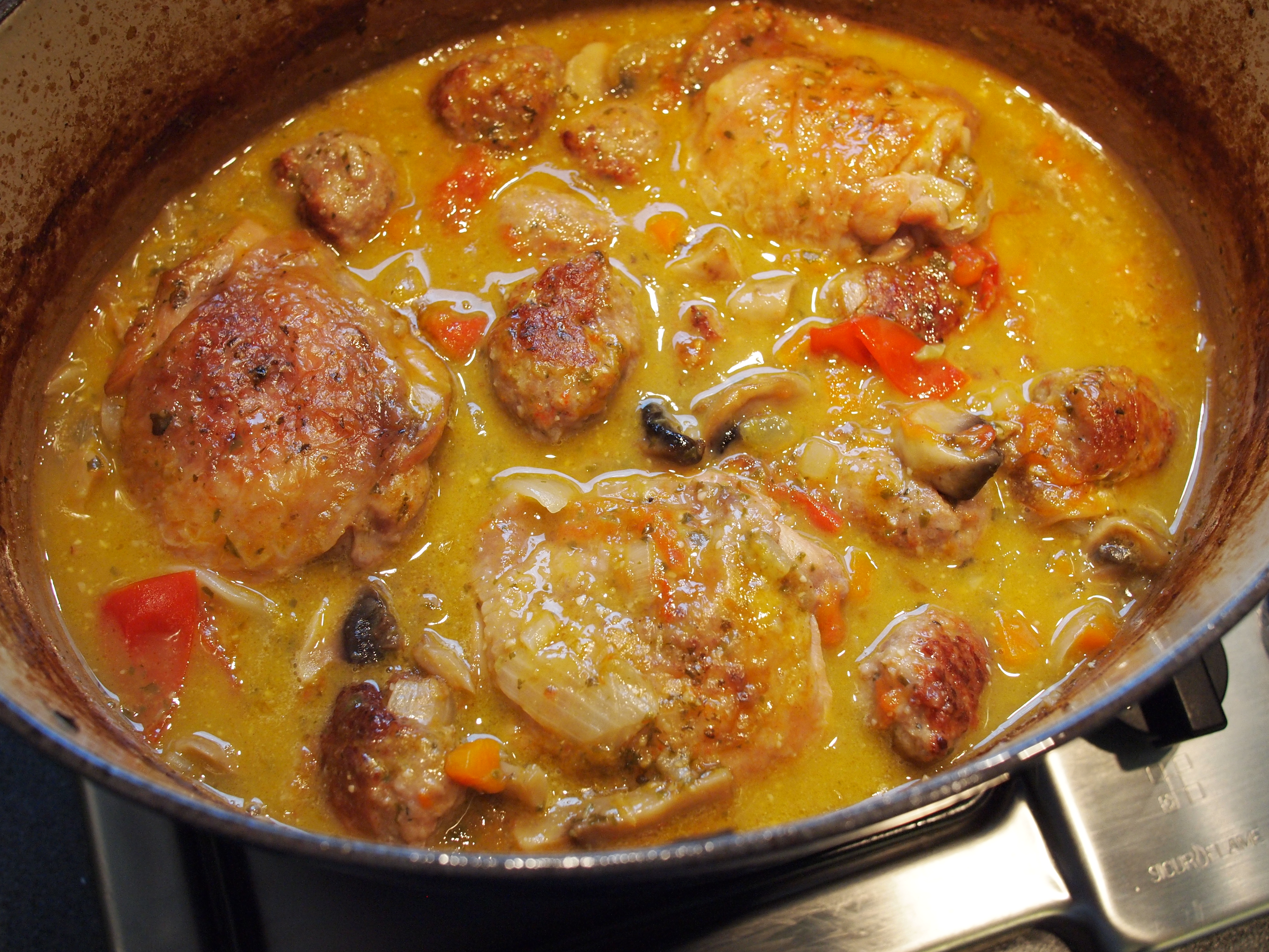 Once they’re done, brown off some chicken thighs. Remove them and in the same pan, sweat an onion, carrot, celery, garlic and mushrooms.