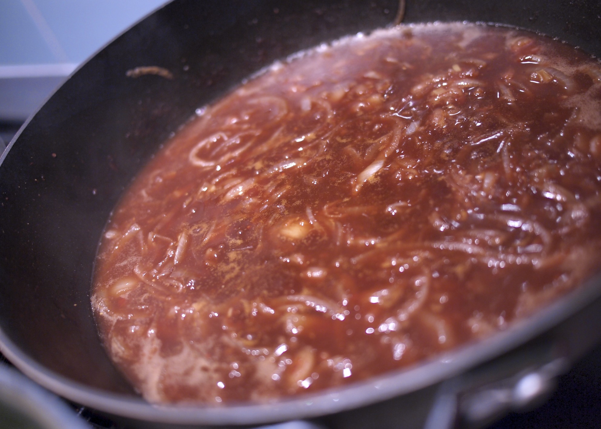 Top this up with about 400ml of stock (chicken, beef or veg) and let it simmer for another ten minutes until thick and glossy.