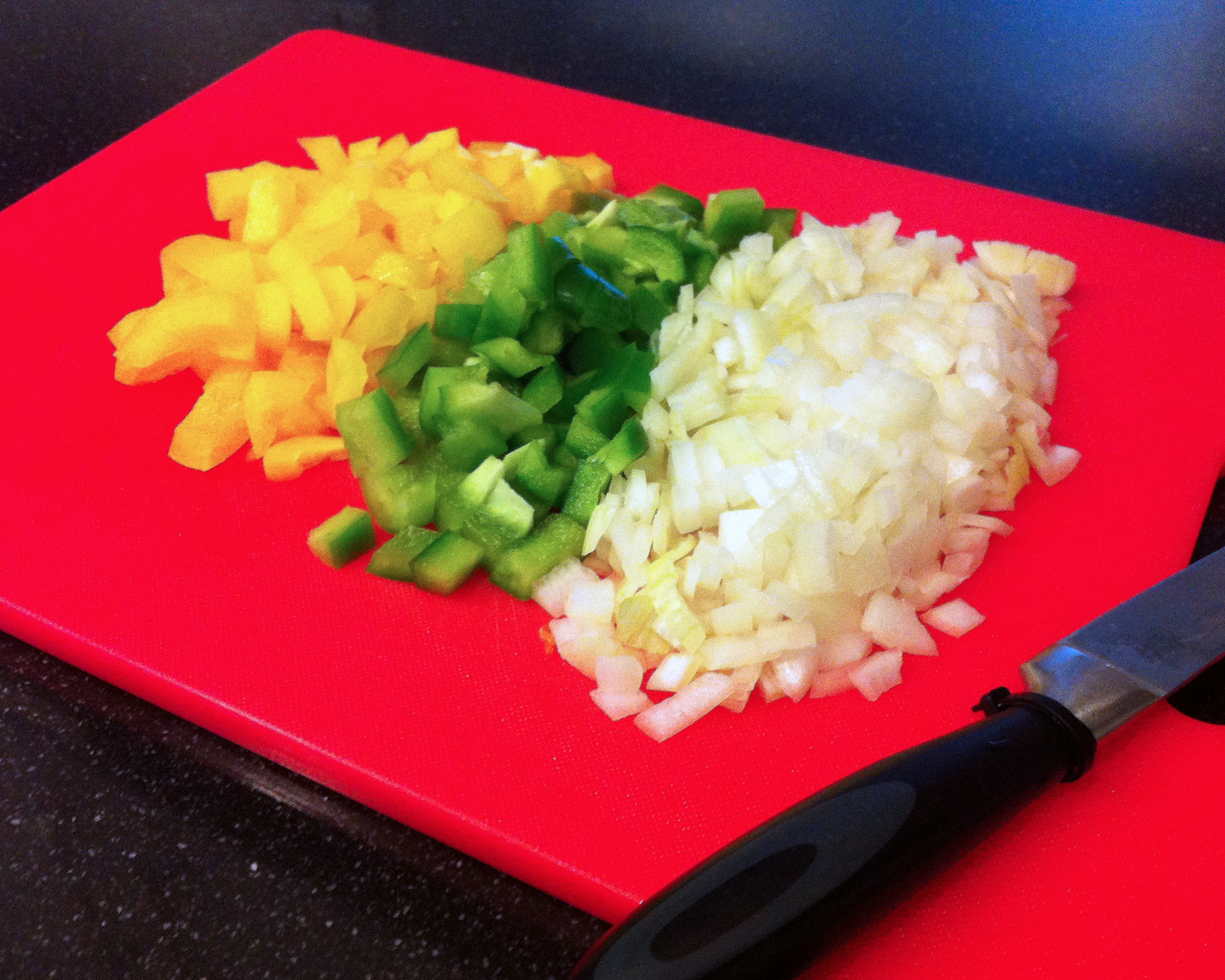 The first thing to do is chop two bell peppers (it doesn’t matter which colour) and an onion into smallish cubes. (Is this called dicing?)