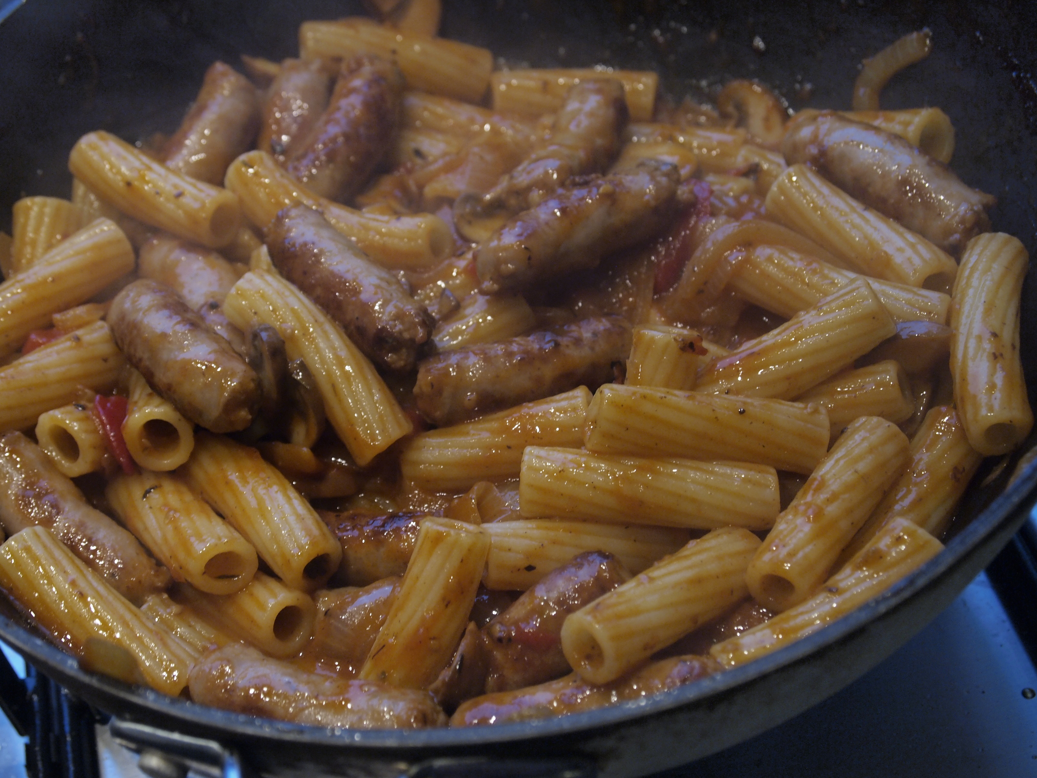 Fry these in a little oil until they brown and remove to a dish. In the same pan, fry a diced onion and maybe some mushrooms, peppers or courgettes, whatever’s in the fridge.