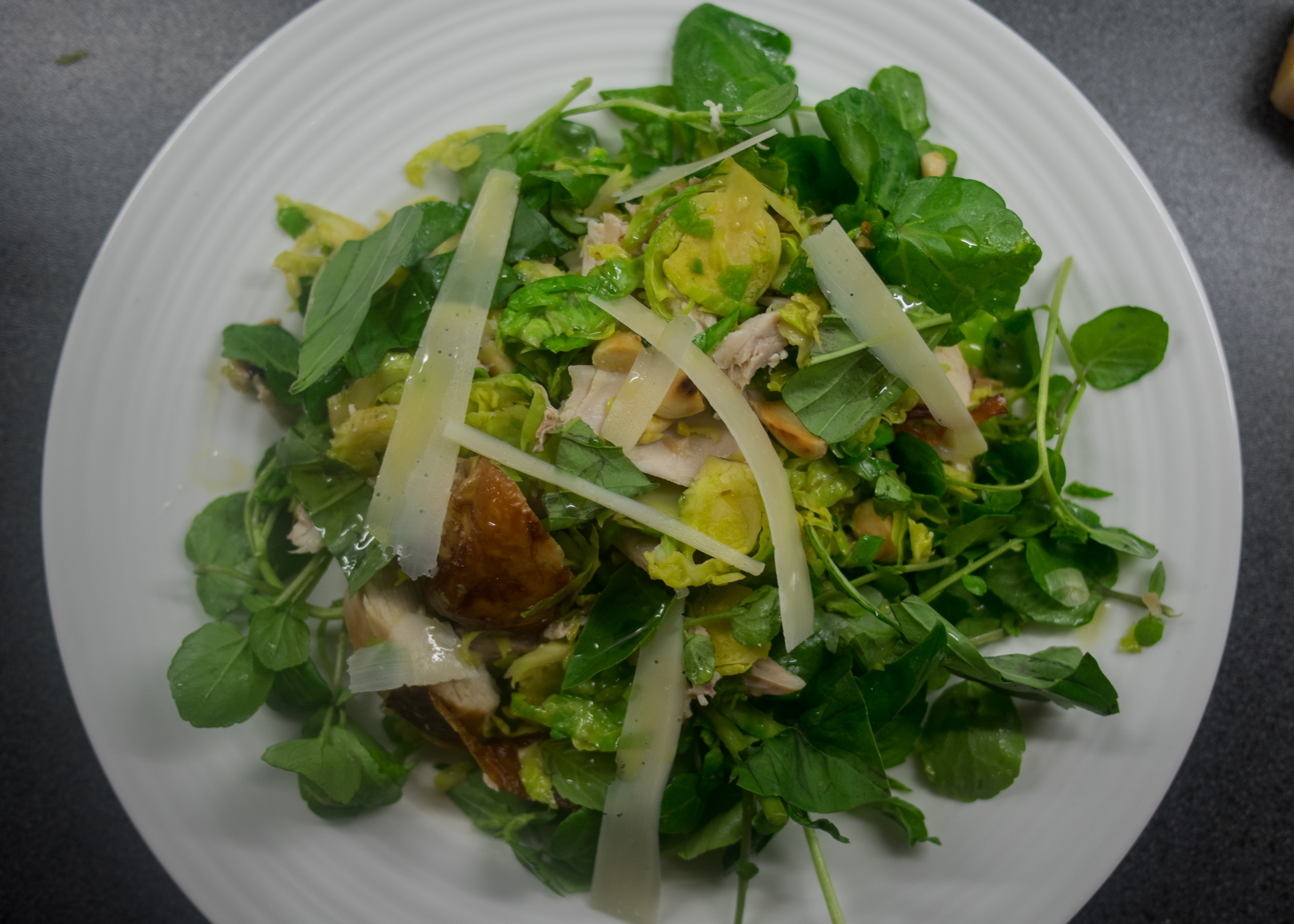 Take this off the heat and prep the chicken – needs to be in bite-size pieces. Stir this carefully through the sprouts and season well. Add the almonds and a couple of handfuls of watercress.